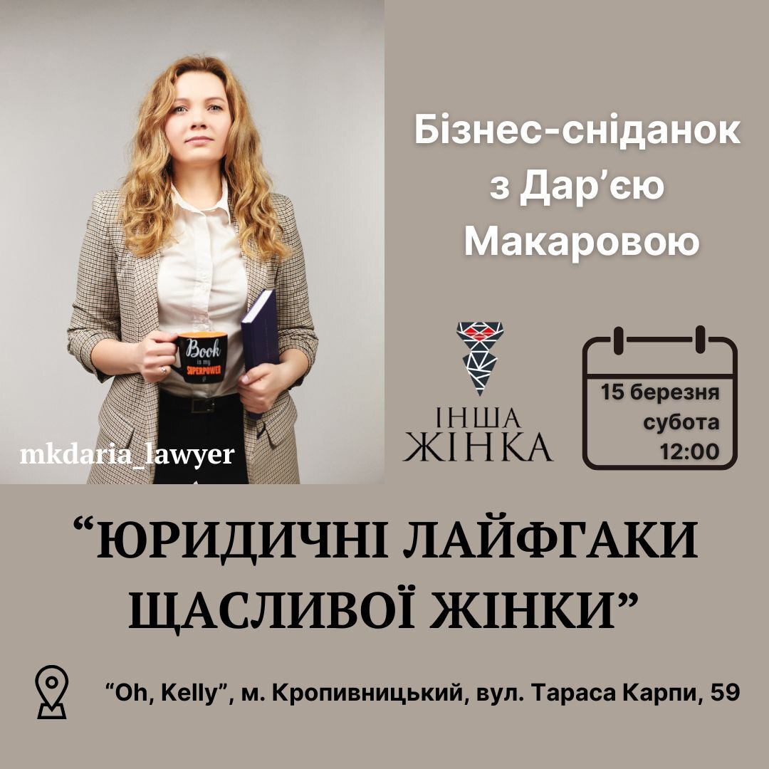 Запрошуємо вас на перший захід цієї весни від ГО "Інша жінка" в Кропивницькому - бізнес-сніданок на тему "Юридичні лайфгаки щасливої жінки"