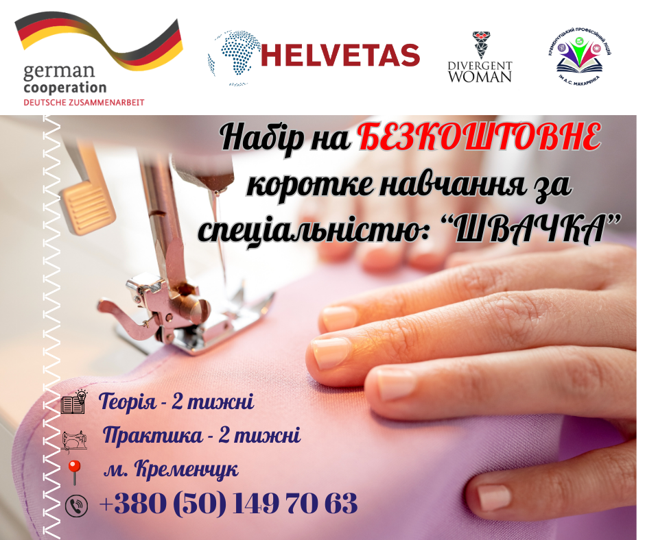 ❗️ Громадська організація «Інша Жінка» спільно з партнером – Кременчуцький професійний ліцей ім. А. С. Макаренка запрошує жінок та чоловіків на БЕЗКОШТОВНЕ навчання з отриманням часткової кваліфікації за професією:
