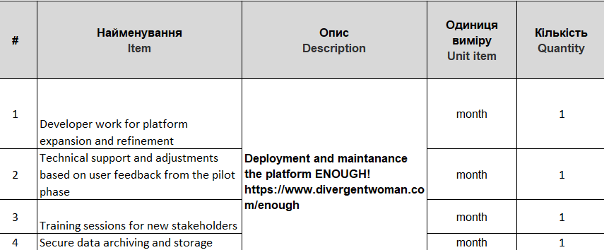 Мета: Забезпечення технічного розвитку, підтримки, масштабування та безперервного функціонування онлайн-платформи “ENOUGH!” — цифрового інструменту збору, збереження й обробки даних про випадки ґендерно зумовленого насильства (ГЗН) в Україні з фокусом на безпечне збереження інформації, розширення функціоналу та навчання нових користувачів.